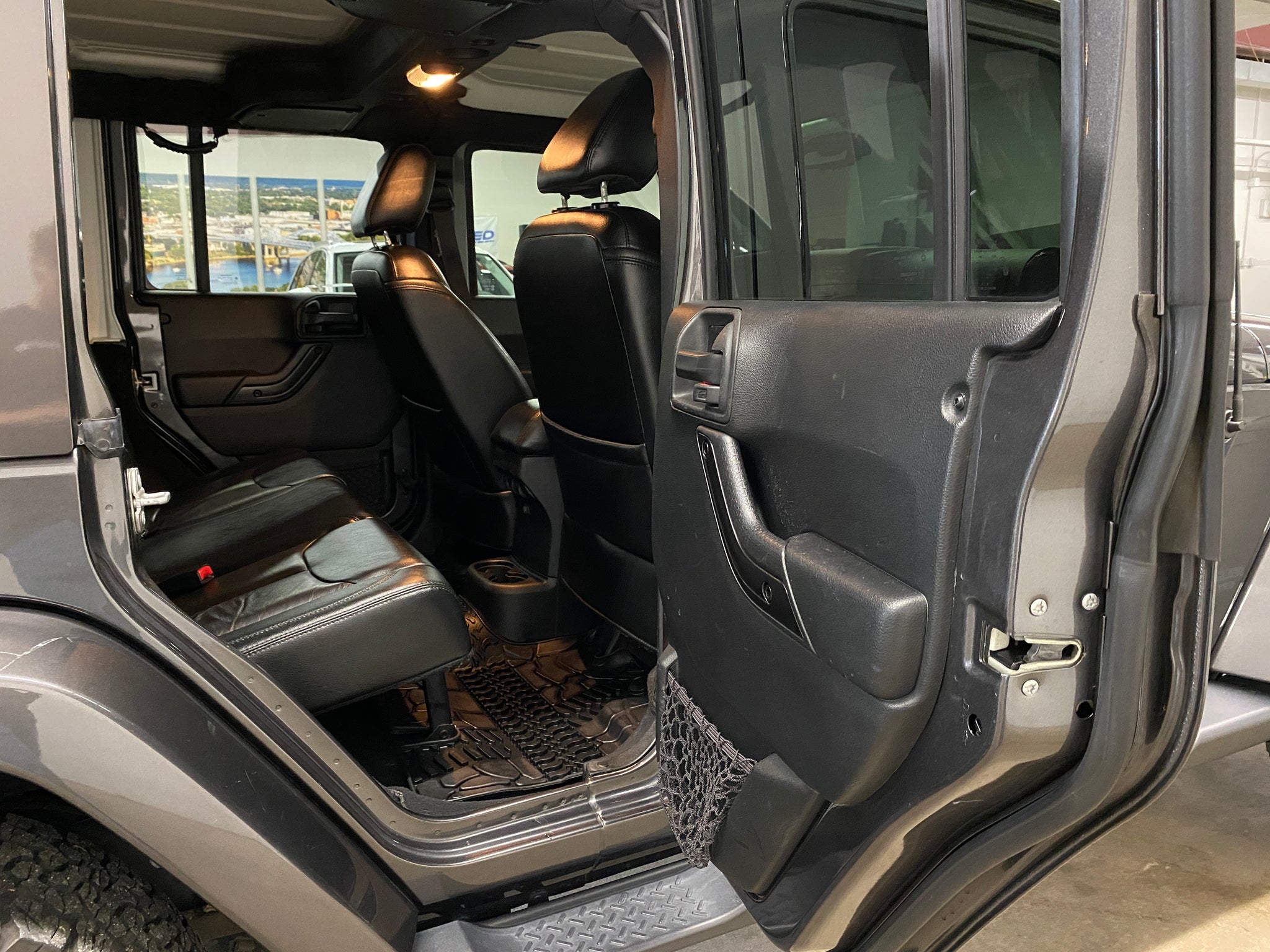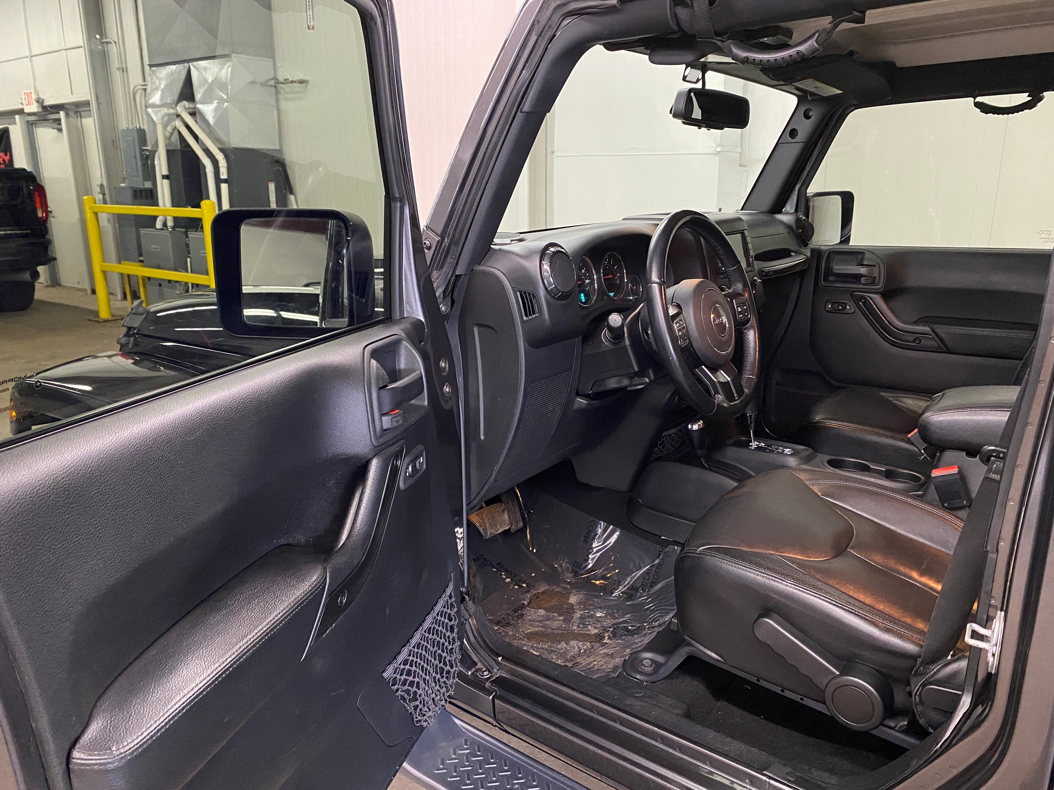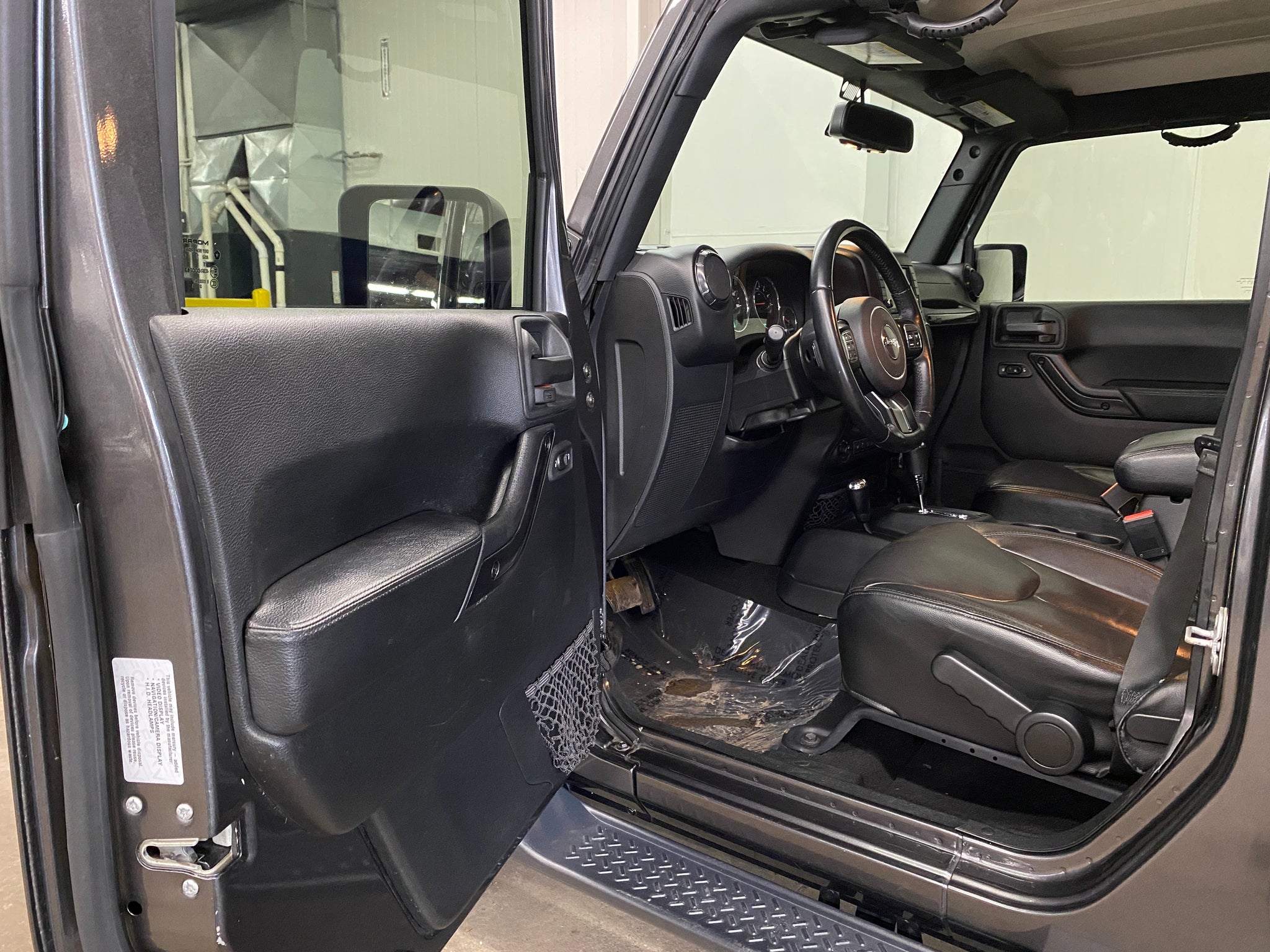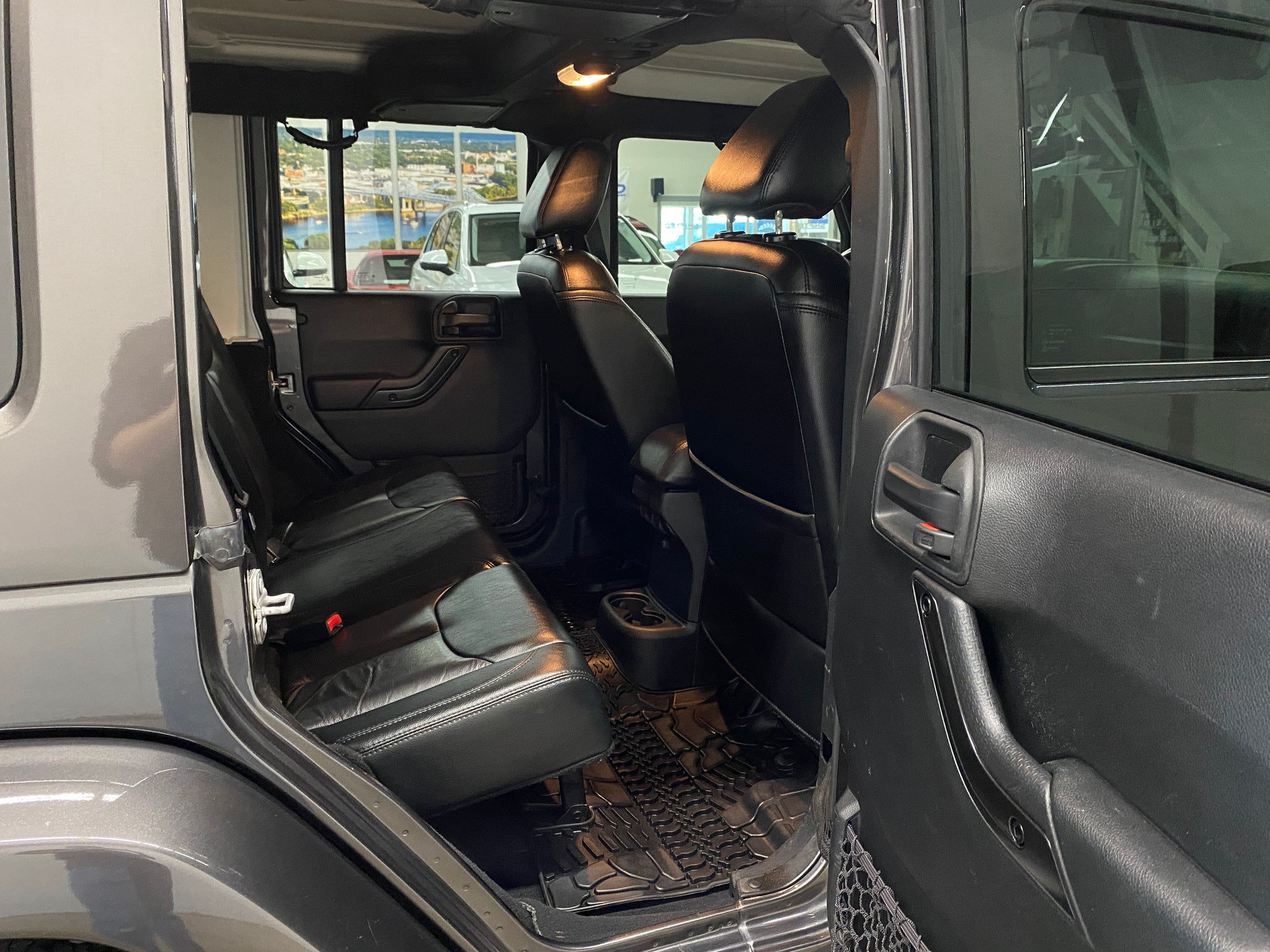 Only one previous owner with extensive documented service records! Granite Crystal Metallic Clearcoat over a black leather interior equipped with a 3.6L V6, automatic transmission, 4WD, heated front seats, color-matched removeable hard top, steering wheel controls, remote start, voice activated calling, cruise control, power windows, mirrors, and doors. Included with sale is one key and Jeep tool kit. An inspection and service was just completed. Please contact us for additional information and to schedule a test drive. Thank you!