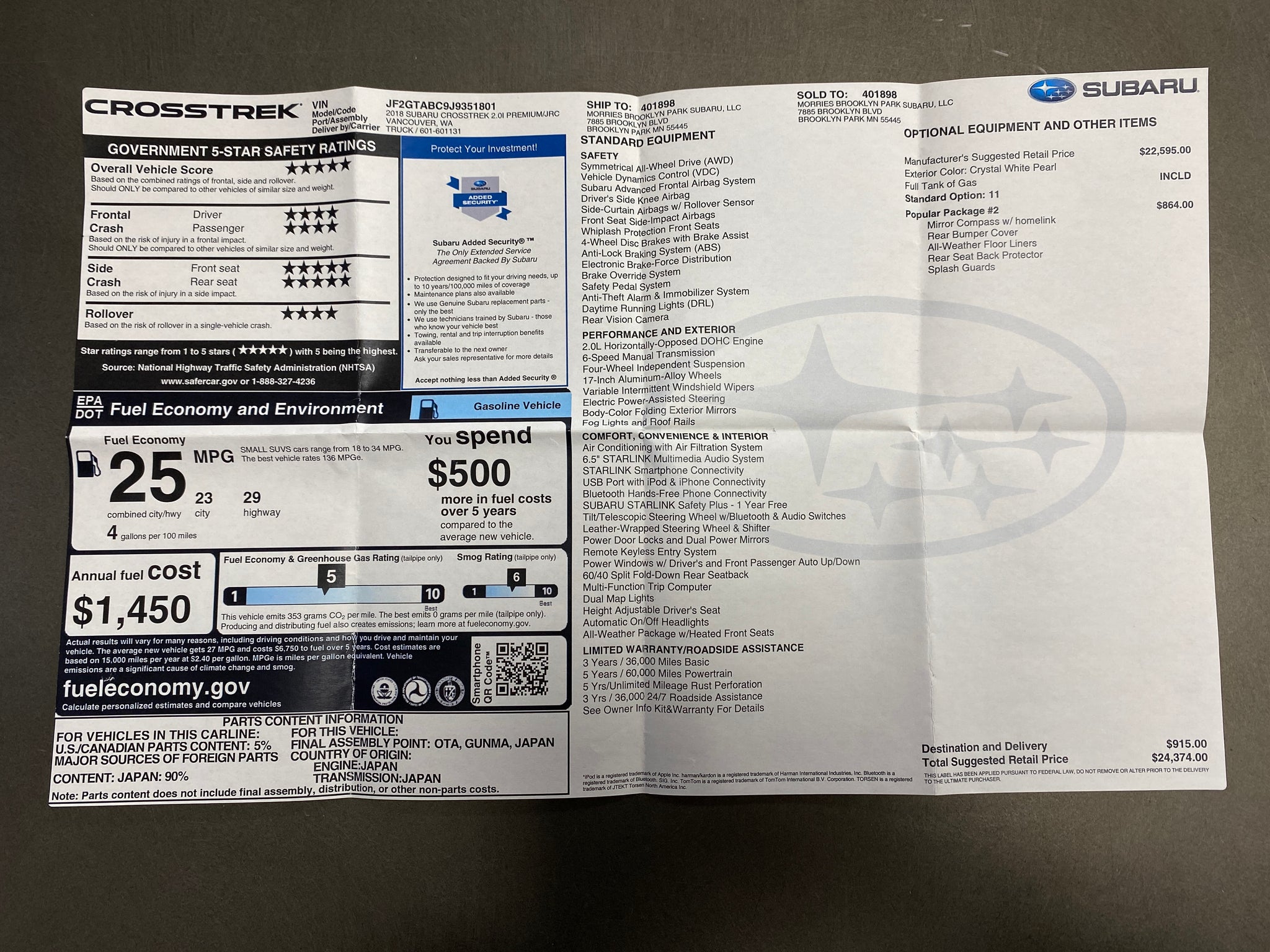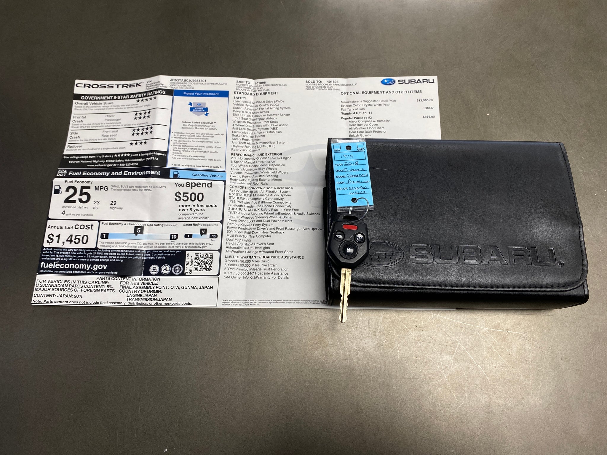 Low miles with documented service records! Finished in Crystal White Pearl over black and gray cloth interior. Equipped with a 2.0L H4, AWD, 6-speed manual transmission, 17-inch alloy wheels with Yokohama Geolandar all-season tires, heated front seats, 6.5 inch infotainment screen with backup camera, fog lights, cargo cover, and all-weather floormats. Included with sale is one master key and owner's books/manual. An inspection and service was just completed. Please contact us for additional information and to schedule a test drive. Thank you!