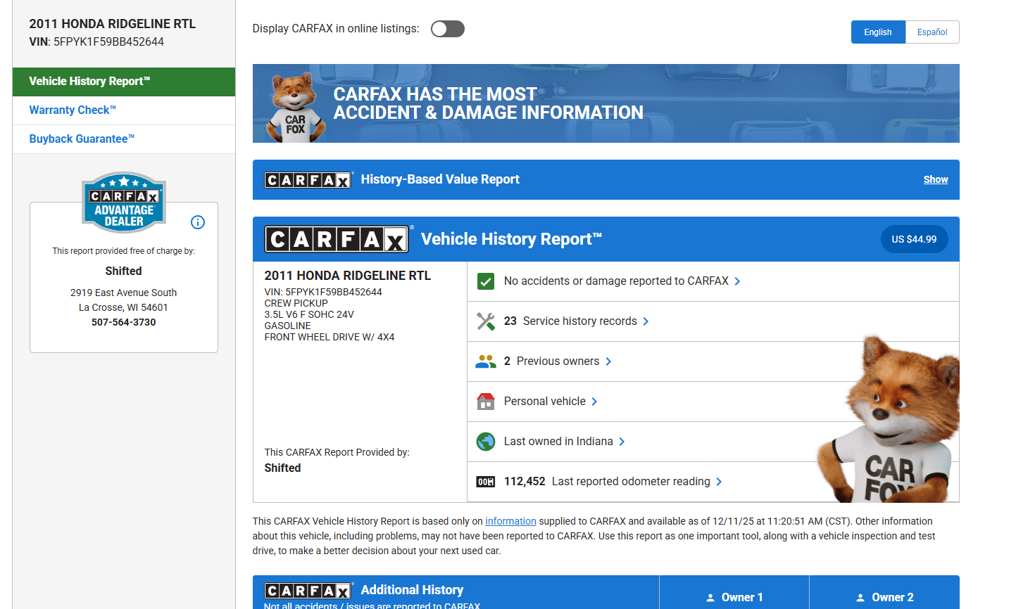 VIN: 5FPYK1F59BB452644 Miles: 112,453